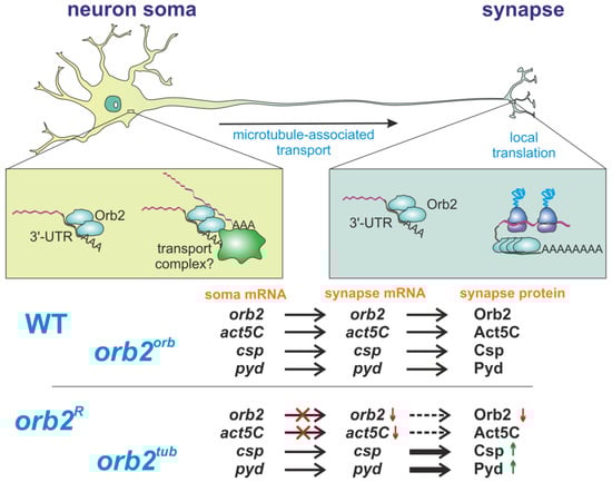 A model of the orb2 role in neurons. The Orb2 protein participates in two major processes, intracellular transport in neurons and local translation in synapses. In the soma, Orb2 binds to the 3′UTRs of its target transcripts and participates in the formation of transport-competent mRNP. This mechanism is valid for several transcripts—e.g., Orb2 is required for intracellular transport of its own mRNA and the act5C mRNA to synapses, but not for transport of the csp and pyd transcripts. The orb2R and orb2tub mutants thus show lower synaptic levels of the orb2 mRNA and Orb2 protein. In synapses, Orb2 participates in regulating translation. The orb2R and orb2tub mutants consequently show higher levels of csp and pyd mRNA translation in synapses. The orb2orb mutant shows complete rescue of the described molecular defects.