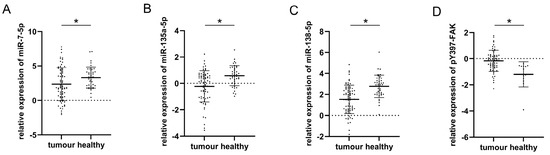 Comparison of plotted values of RT-qPCR analysis of miRs-7-5p (A), -135a-5p (B), and -138-5p (C); plotted values of densitometry quantification of pY397-FAK Western blot normalized to β-actin (D) in malignant and healthy tissue. Mean values and standard deviations are represented with horizontal lines. All data were transformed logarithmically. * p < 0.05.