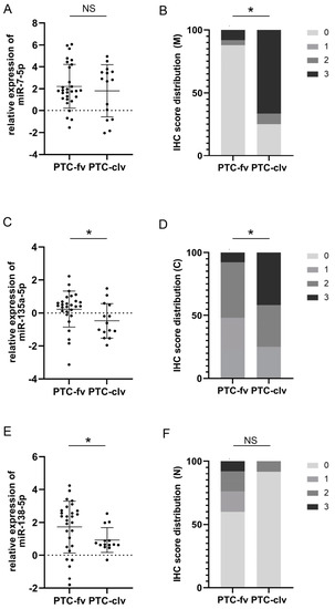 Comparison of plotted values of RT-qPCR analysis of miRs-7-5p (A), -135a-5p (C), and -138-5p (E) in PTC-fv and PTC-clv. Mean values and standard deviations are represented with horizontal lines. All data were transformed logarithmically. Distribution of immunohistochemical scores of pY397-FAK in the membranous compartment (B); cytoplasmic compartment (D) and nuclear compartment (F) between PTC-fv and PTC-clv. * p < 0.05. NS stands for non-significant.
