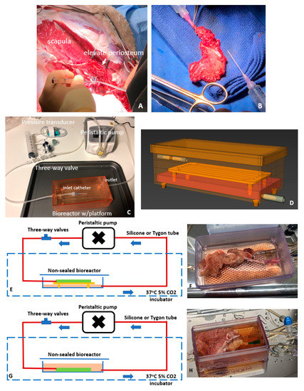 Periosteum procurement and ex vivo perfusion for tissue preservation. Vascularized periosteal flaps collected from sheep scapula (A,B). Primary components of the perfusion bioreactor system for periosteal maintenance (C,D). Perfusion system configuration for dry perfusion (E,F) and wet perfusion (G,H).