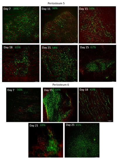 Initially, periostea (1 and 2) were perfused for only 4 days, with succeeding studies continued for up to 25 days. Live/Dead cell analysis, PrestoBlue cell viability and metabolic assays supported the proof-of-concept for the maintenance of periosteal flaps within the bioreactor perfusion system. Firstly, measures of cell viability, using Calcein AM and Eth-D-1, ranged from 25% in the initial preliminary trials and increased to 65% following the refinement of the system. As shown in Figure 2, the proportion of live cells within the periostea increased with the longer duration of perfusion and successive trials.