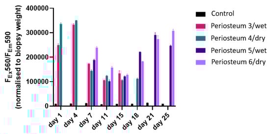Figure 3 demonstrates the PrestoBlue assays performed on periosteal biopsies collected from each perfusion system at various time points. As shown, while negligible cell viability indicators were detected in the negative control medium, it was clearly detectable for periosteum perfusates. For periosteum 3 and periosteum 4, a notable decrease was measured following day 4, with levels stabilizing from day 11. For periosteum 5 and periosteum 6, metabolic activity initially declined until day 15, but recovered thereafter with increasing activity for the duration of testing up to day 25.