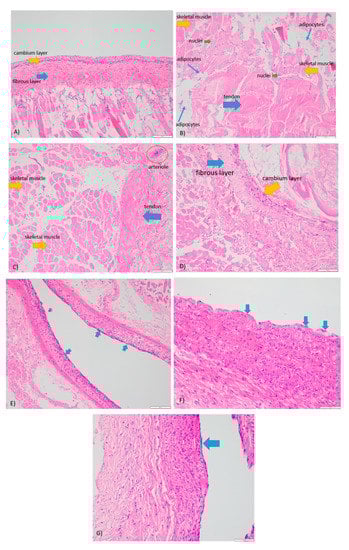 Figure 4, as shown below, demonstrates the histological staining for periosteum 3, 4, 5, and 6, where cellular viability was assessed according to the morphology and integrity of cellular membrane and nucleus. All specimens showed appropriate amounts of muscle, fibrocollagenous tissue, fat, and periosteum with high cellular viability. Focal fat necrosis was seen in periosteum 3, 4, and 5, and focal areas of devitalized anucleate myocytes were adherent to periosteum 4 and 5. Degenerative changes were seen predominantly at the periphery of the tissue sections and most likely represent the handling artefact. Periosteum 6 exhibited the highest degree of cellular viability consistent with the Live/Dead and PrestoBlue assays. The blood vessels in all periosteum specimens were viable with preserved endothelial cells (Figure 4E–G), demonstrating the efficacy of the perfusion system to maintain the structural integrity of the blood vessels in each periosteum. Well-defined fibrous and cambium layers were observed for periosteum 3 (Figure 4A), while periosteum 6 (Figure 4D) showed the increased fragmentation of the cambium layer. Whilst we were unable to identify a clearly defined inner cambium layer in specimens 4 and 5, both showed viable adipocytes, skeletal muscles, and fibrocollagenous tissue (Figure 4B,C).