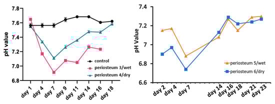 Figure 5 (shown below) demonstrates the changes in pH of the perfusion medium. The fresh medium was stored in the incubator as the control and pH change was buffered by 5% CO2 in the incubator and bicarbonate in the medium. The control pH for periosteum 3 and periosteum 4 was approximately 7.6, and for periosteum 5 and periosteum 6, the control pH was 7.4. In all four experiments, the pH declined quickly during the first 7 days, and then gradually returned to the baseline value at the end of the experiments. One mechanism which may account for the increased medium acidity from day 1 to day 7 is lactate production due to cell death [27]. After day 7, the culture medium was decreasingly consumed, and the pH value returned to that of the control medium.