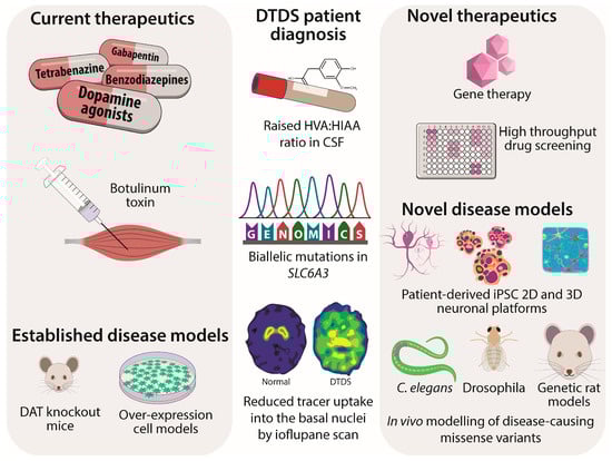 Since the first clinical report of infantile parkinsonism-dystonia with paradoxically raised dopamine metabolites, there have been profound advances in understanding DTDS. Advances in genomic analysis have transformed the diagnostic process for these children; the identification of the causative gene has facilitated the recognition of a distinct clinical syndrome, whilst increasing diagnostic access to next-generation sequencing technologies has prompted earlier diagnoses []. Such genomic advances have also allowed the recognition of broader clinical phenotypes associated with SLC6A3, encompassing DTDS parkinsonism-dystonia, early onset parkinsonism, and neuropsychiatric diseases (ADHD and ASD). Over the last decade, we have now identified 51 patients with DTDS. The ability to model disease-causing missense mutations in vitro has provided significant mechanistic insight. Our experience of evaluating DTDS patients confirms that the currently available treatment options are inadequate and palliative at best. Significant efforts to develop disease-modifying novel therapeutics for DTDS patients are now needed, and it is reassuring to know that approaches exploring the potential utility of novel pharmacochaperones and translational viral gene therapy approaches are underway. With the advent of new disease models such as 3D organoid modelling, it will be possible to better represent the brain microenvironment with various neuronal cell types and mimic the complexity of brain homeostasis in disease states to evaluate the effects of DAT dysfunction in human neuronal networks (Figure 1). Such humanised model systems will also provide a novel therapeutic platform for testing new experimental treatments. The ability to model DAT in multiple models in vitro and in vivo will prove invaluable to understanding disease mechanisms, the overlap between movement and neuropsychiatric phenotypes, and the therapeutic window—all with the ultimate aim of developing better precision medicines for DTDS patients.