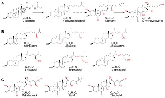 Structures of different sterols and ecdysteroids. (A) Structures of C27 sterols and ecdysteroids. (B) Structures of C28 and C29 dietary sterols. (C) Structures of C28 ecdysteroids.