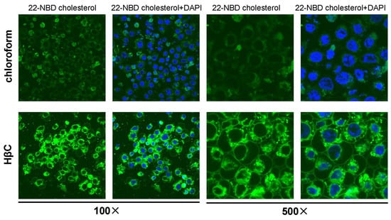 The comparison of the uptake efficiency of Kc cells to chloroform-dissolved 22-NBD cholesterol and HβC-dissolved 22-NBD cholesterol.
