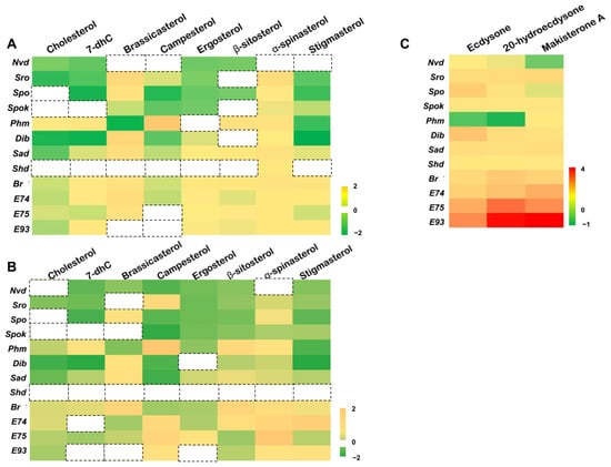 A heatmap of the relative expression of 20E biosynthetic and response genes in Kc cells treated with different sterols. Cholesterol, 7-dehydrocholesterol (7-dhC), brassicasterol, campesterol, ergosterol, β-sitosterol, stigmasterol, and α-spinasterol belong to dietary sterols. E, 20E, and MaA were used to compare the effects of different ecdysteroids. The control group in (A) was treated with chloroform, that in (B) was treated with 45% HβC, and that in (C) was treated with DMSO. Green indicates the lowest expression and red indicates the highest expression. The fold changes in gene expression levels were log2 transformed.