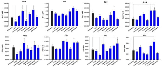Expression changes in Drosophila 20E biosynthetic genes upon different dietary sterol treatments. Cholesterol was added as a control (black), while other dietary sterols (blue) were used to be compared with it. Data are reported as means ± standard deviation of three independent biological replications. The relative expression was calculated based on the value of the reference genes. Asterisks indicate a significant difference, as calculated using two-tailed unpaired Student’s t-test (* p < 0.05).