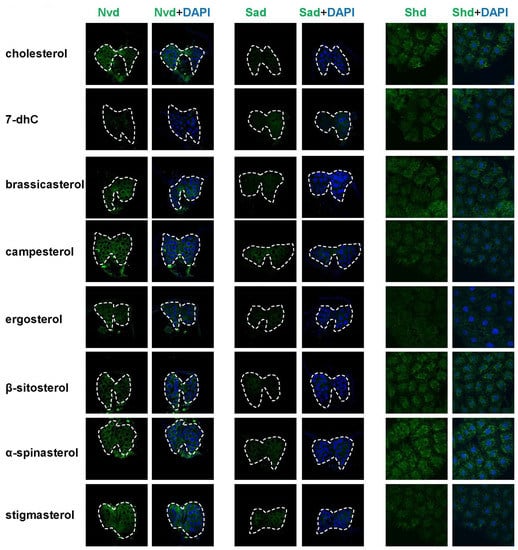 The brain-ring gland complex and fat body of different sterol treatments were dissected in the white prepupal stage in the PBS (pH 7.0). Dissected tissues were fixed and stained with antibodies according to standard procedures. The primary antibodies used included rabbit anti-Nvd (1:200), rabbit anti-Sad (1:200, SHW-101AP, FabGennix, Frisco, TX, USA), and rabbit anti-Shd (1:200, SHD-101AP, FabGennix). The secondary antibody was Alexa FlourTM 488 goat anti-rabbit IgG (1:200, A-11008, ThermoFisher, Waltham, MA, USA). The rabbit polyclonal antibody against Drosophila Nvd was generated via the immunization of rabbit with epitope YNHKRDTINRLRKLK by ChinaPeptides (Shanghai, China). DAPI was used for nuclei labeling. Fluorescence signals were detected using an Olympus Fluoview FV3000 confocal microscope at 40× magnifications.