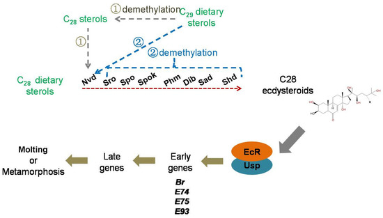 Ecdysteroids are assumed to be the principal steroid hormones regulating insect growth and development, especially molting and metamorphosis, including egg hatching, larval–larval molting, and larval–pupal–adult metamorphosis [1,2,3]. Sterols are precursors for steroid hormones. While vertebrates can produce steroid hormones from cholesterol that is synthesized endogenously de novo, insects are sterol auxotrophs, unable to biosynthesize cholesterol, and therefore must rely on dietary sterols for ecdysteroid biosynthesis [4]. Zoophagous insects can obtain cholesterol synthesized by other animals. But, for fungivorous insects, the dietary sterol is mainly ergosterol. And, for herbivorous insects, these dietary sterols are a variety of different phytosterols, such as campesterol, brassicasterol, β-sitosterol, stigmasterol, and α-spinasterol. These phytosterols typically differ from cholesterol in the number and position of double bonds in the tetracyclic sterol nucleus or in the side chain, or by having additional substituents, such as methyl or ethyl groups at C-24 in the side chain (Figure 1) [5].