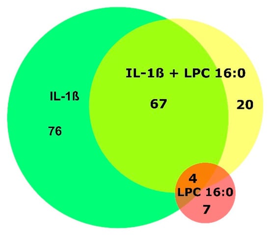 Venn diagram of 174 proteins reproducibly regulated by LPC 16:0 (red), IL-1β alone (green), and LPC 16:0 in the presence of IL-1β (yellow). The number of reproducibly regulated proteins is shown, whereas Tables S1–S3 display the AR of each protein with the results of the statistical analysis.