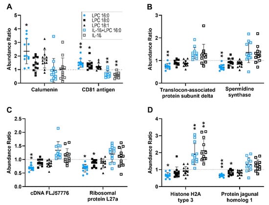 LPC 16:0 reproducibly regulated eleven proteins, with no additional IL-1β added to the cells (Figure 1, Table S1). LPC 16:0 was the most active LPC species, significantly upregulating (A0A024R755, P60033) or downregulating (P51571, P19623, B4E2C1, Q9BQQ5, Q7L7L0, A0A3B3ITE9) eight proteins (Figure 2, Table S1). The levels of three proteins, although not reproducible, were significantly elevated (P60033) or decreased (Q9BQQ5, A0A3B3ITE9) by LPC 18:0. LPC 18:1 and the LPA species had no stimulatory or inhibitory effect on the level of any protein (Figure 2, Table S1). In the presence of IL-1β, LPC 16:0 did not have any additional effects. Thus, IL-1β appears to have a dominant effect, antagonizing even the stimulatory and inhibitory effects of LPC 16:0 on the expression of 11 proteins (Figure 2, Table S1).