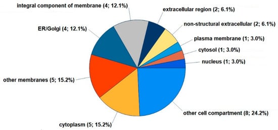 The differentially expressed proteins resided in several cellular structures, many of which were integral components of a membrane (P60033, P51571, B4E2C1, A0A3B3ITE9), the plasma membrane (P60033), the ER/Golgi (A0A024R755, P51571, B4E2C1, A0A3B3ITE9), the nucleus (Q7L7L0), other cell compartments (all eight proteins), and the cytosol/cytoplasm (A0A024R755, P51571, P19623, B4E2C1, A0A3B3ITE9) (Figure 5).