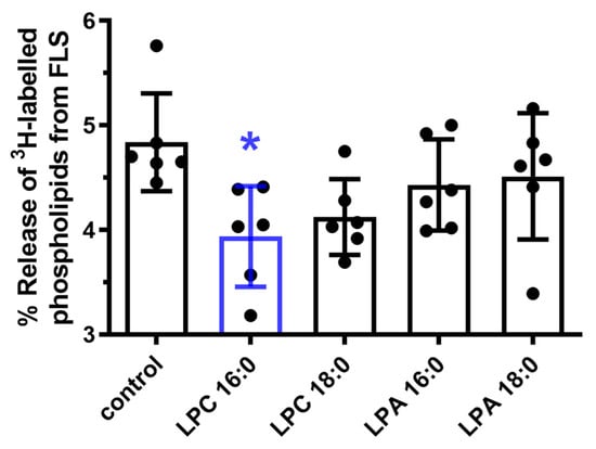 Figure 6 demonstrates that only LPC 16:0 significantly inhibited the release of [3H]-labeled PLs from prelabeled FLSs into the nutrient media, by approximately 19% (p = 0.012), indicating again that LPC 16:0 is the most bioactive LPC species tested.