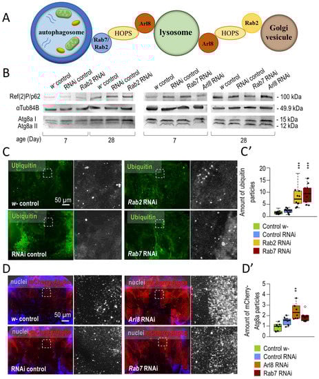 Silencing of small GTPases Rab2, Rab7, and Arl8 inhibits autophagy and limits lifespan. (A,A’) The plots show the relative change in the amount of Ref(2)P/p62 protein in response to small GTPase silencing. Samples are isolated from the heads of 7- and 28-day-old animals. (B,B’) Figures show antibody labelling and evaluation of ubiquitinated protein aggregates (green). (C,C’) The effect of Rab2-RNAi on the abundance of mCherry-Atg8a-positive (red) structures in the brains of adult females was tested. (D,D’) Graphs show the average survival data (Rab2-RNAi, Arl8-RNAi and Rab7-RNAi, as well as their corresponding controls). Silencing of small GTPases (Arl8, Rab2, Rab7) has a negative effect on lifespan. Boxes represent the most typical 50% of the samples, the line indicates the median, and upper and lower whiskers show the remaining 25–25% of the samples. Circles mark outliers. *: p < 0.05, **: p < 0.01, ***: p < 0.005; statistical analysis was performed as described in the Section 2.