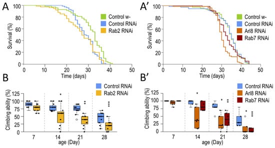 Neuronal silencing of small GTPases (Arl8, Rab2, Rab7) reduces lifespan and decreases climbing ability in Drosophila. (A,A’) Kaplan–Meier lifespan curves of Drosophila. Using a Ddc-Gal4 driver, Rab2, Arl8, and Rab7 were silenced only in dopaminergic and serotonergic neurons, and compared to isogenic w1118 and ON-target free RNAi controls (both controls were crossed with Ddc-Gal4). Neuronal silencing of small GTPases reduces lifespan. (B,B’) Plots represent climbing ability of animals silenced for a small GTPase. Climbing was measured at 20 s. The lack of small GTPases impairs the climbing ability of animals. The boxes represent the most typical 50% of the samples, the line indicates the median, and upper and lower whiskers show the remaining 25–25% of the samples. Circles mark outliers. *: p < 0.05, **: p < 0.01, ***: p < 0.005; statistical analysis was performed as described in the Section 2.