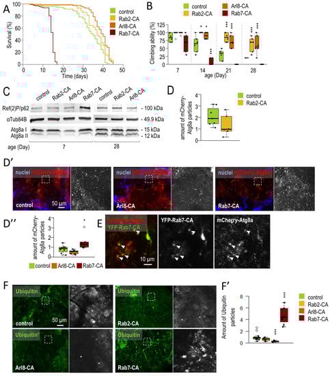 Neuron-specific activation of Rab2 and Arl8 extends lifespan and enhances autophagy. (A) Kaplan–Meier lifespan curves of Drosophila. Constitutively active forms of the small-GTPase proteins Rab2 (Rab2-CA), Arl8 (Arl8-CA), and Rab7 (Rab7-CA) in dopaminergic and serotonergic neurons were tested (using Ddc-Gal4 driver). Our results show that Rab2-CA and Arl8-CA increase, while Rab7-CA decreases lifespan. (B) Moving ability of Rab2-CA, Arl8-CA, and Rab-7-CA animals were observed at different adult ages. The activation of Rab2 and Arl8 oppositely varies the climbing ability of animals compared to Rab7 activation Climbing was measured at 20 s. (C) Western blot analysis showing p62/Ref(2) and Atg8a-II levels. Ref(2)P and Atg8a-II serve as substrates for autophagy; thus, their levels inversely correlate with autophagic capacity. αTub84B protein was used as internal control. For measurements, proteins were isolated from the head of young (7 days old) and old (28 days old) female flies. (D–D’’) The abundance of mCherry-Atg8a-positive (red) foci refers to autophagic vesicles, measured in small-GTPase activated and control genetic backgrounds. Nuclei were stained by Hoechst dye (blue). Rab7-CA increases the amount of mCherry-Atg8a structures, while Rab2 and Arl8 activation decreases them. (E) Colocalization error can be found between the colocalization of YFP-Rab7-CA-(YFP-bounded protein—green) and mCherry-Atg8a-positive (red) structures. (F,F’) Ubiquitinated aggregates are digested by autophagy. Amounts of ubiquitinated proteins (green) were measured in adult brains with hyperactivated small-GTPase proteins. Rab2 and Arl8 activation decreased, whereas Rab7 activation increased, ubiquitin aggregation in Drosophila brains. For the measurement, animals were maintained at 29 °C during adulthood, and Ddc-Gal4 triggered the overexpression of constitutively active form of small-GTPase. The white dashed line squares indicate the magnified detail in the fluorescence images. Boxes represent the most typical 50% of the samples, the line indicates the median, and upper and lower whiskers show the remaining 25–25% of the samples. Circles mark outliers. *: p < 0.05, ***: p < 0.005; statistical analysis was performed as described in the Materials and Methods.