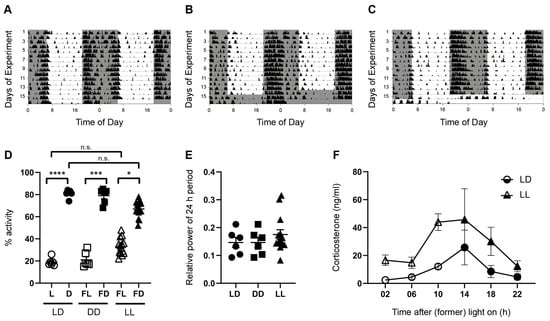 Rhythms in spontaneous locomotor activity and plasma corticosterone levels. Representative double-plotted actograms of spontaneous locomotor activity of mice kept for 14 days in a standard photoperiod of 12 h light (L) and 12 h darkness (D), followed by at least 38 h of (A) LD, (B) constant darkness (DD), or (C) constant light (LL). Black bars indicate activity. Gray boxes indicate periods of darkness. (D) Proportion of activity as a percentage of total activity in L or former L (FL) (open symbols), and D or former D (FD) (closed symbols) of mice kept in LD (circles), DD (squares), or LL (triangles). Bars represent the mean ± SEM of six mice per group (LD and DD) and 18 mice per group (LL). Kruskal–Wallis test: n.s., not significant; * p < 0.05; *** p < 0.001; **** p < 0.0001. (E) Power analysis of the 24 h period in mice kept in LD, DD, and LL. Bars represent the mean ± SEM of six mice per group (LD and DD) and 18 mice per group (LL) (Kruskal–Wallis Test). (F) Serum corticosterone levels were rhythmic (effect of time) but higher in mice kept in LL than in mice kept in LD (effect of lighting condition). Two-way ANOVA on rank, p < 0.0001. Bars represent the mean ± SEM of three mice per timepoint.