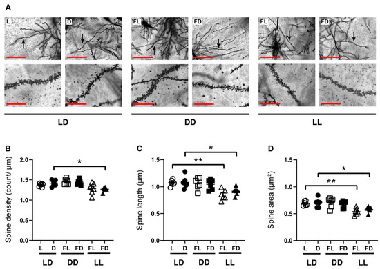 Hippocampal spine morphology is affected by acute constant light. (A) Representative microphotographs of Golgi–Cox-stained apical dendritic spines in the dorsal hippocampus of mice kept in a standard photoperiod (LD) of 12 h light (L) and 12 h darkness (D), in constant darkness (DD), or in constant light (LL), sacrificed in L, D, former L (FL), or former D (FD). Scale bar, 50 µm. Higher magnification of the dendrite indicated by the arrow. Scale bar, 12.5 µm. Quantification of (B) spine density, (C) spine length, and (D) spine area of mice kept in LD (circles), DD (squares), or LL (triangles) and sacrificed in L or former L (open symbols) and D or former D (closed symbols). Bars represent the mean ± SEM (n = 6 hippocampal slides of three mice per group). One-way ANOVA: * p < 0.05; ** p < 0.01.