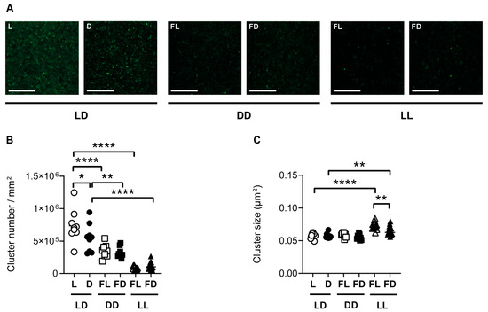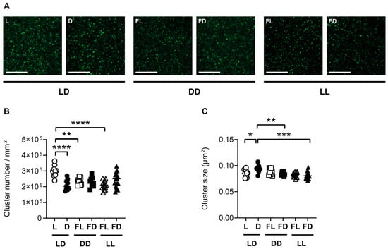 Synaptopodin is affected by the light/dark phase and acute constant light. (A) Representative confocal laser microscopic pictures of synaptopodin immunoreactive clusters in the CA1 region of the dorsal hippocampus of mice kept in a standard photoperiod (LD) of 12 h light (L) and 12 h darkness (D), in constant darkness (DD), or in constant light (LL), sacrificed in L, D, former L (FL), or former D (FD). Scale bar, 20 µm. Quantification of (B) cluster number and (C) cluster size of mice kept in LD (circles), DD (squares), or LL (triangles) and sacrificed in L or FL (open symbols) and D or FD (closed symbols). Bars represent the mean ± SEM of n = 9 mice per group in LD and DD and n = 15 mice per group in LL. One-way ANOVA: * p < 0.05; ** p < 0.01; *** p < 0.001; **** p < 0.0001.