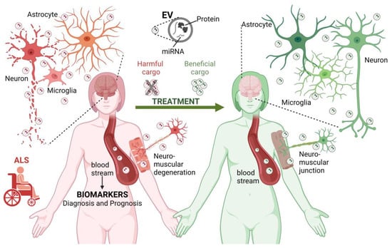 EVs have been associated with numerous pathologies, from metastatic cancers [122] to neurodegenerative diseases such as Alzheimer’s disease and Parkinson’s disease [123,124,125]. Under such pathological conditions, EVs shuttle enclosed misfolded proteins and other neurotoxic elements that can potentially induce dysfunction in recipient cells [125,126]. EVs are increasingly recognized as being of great importance in the pathogenesis of ALS and in the identification of biomarkers, which will be explored in this section (Figure 1).