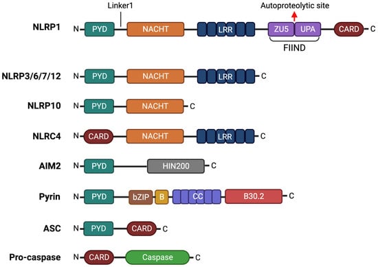 Domain organization of common inflammasome component proteins. NLRP1, NLRP3, NLRP6, NLRP7, NLRP10, NLRP12 and NLRC4 belong to the nucleotide-binding domain and leucine-rich repeat-containing receptor (NLR) protein family, which typically contains a central nucleotide-binding and oligomerization domain (NACHT) domain, an N-terminal Pyrin domain (PYD) domain and a C-terminal leucine-rich repeats (LRR) domain. NLRP1, NLRP10 and NLRC4 deviate from this typical NLR structure. In addition to the common structure, NLRP1 contains a C-terminal function-to-find domain (FIIND) and caspase recruitment domain (CARD), while NLRP10 lacks the LRR domain. The NLRC4 does not have the N-terminal PYD domain but, instead, has an N-terminal CARD domain. AIM2 belongs to the AIM2-like receptor (ALR) protein family and comprises an N-terminal PYD domain and a C-terminal HIN200 domain. Finally, Pyrin consists of an N-terminal PYD domain, a bZIP, B box, coiled-coil and an N-terminal B30.2 domain. Apoptosis-associated speck-like protein containing CARD (ASC) acts as an adaptor protein, consisting of a PYD and CARD, which connects the inflammasome sensor to pro-caspase through PYD and CARD interactions, respectively.
