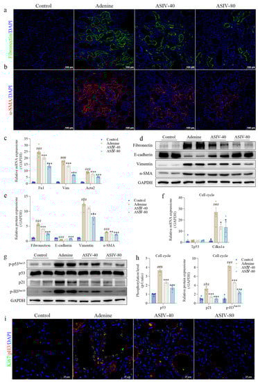 Previous evidence has demonstrated that renal fibrosis is closely related to EMT and G2/M arrest [38,39]. In the present study, compared with the control group rats, a significant increase in the mesenchymal cell markers, fibronectin, vimentin, and α-SMA and a remarkable decrease in the epithelial cell marker E-cadherin were found in the kidneys of the adenine group rats. However, ASIV significantly inhibited EMT by reversing the abnormal expressions above in the CKD rat kidneys (Figure 2c–e), which was further validated using immunofluorescence analysis for fibronectin and α-SMA in the rat kidneys (Figure 2a,b). In addition, we examined the expression of genes or proteins, including phospho-p53 (p-p53), p53, p21, and phospho-histone H3 (p-H3), which were strongly associated with G2/M arrest [40,41]. Compared with the control group rats, significant increases were found in the phosphorylation level of p53 and the expression of p21 and p-H3 in the kidneys of the adenine group rats. Similarly, ASIV also remitted G2/M arrest by inverting the expressions of the related genes and proteins above in the kidneys of the adenine-treated rats (Figure 2f–h). Additionally, we further detected the cell marker Ki67 for proliferation [42] and the cell marker p-H3 [43] for G2/M arrest using immunofluorescence. The results show that the expression of p-H3 and Ki67 both increased in the adenine group and were reversed by ASIV treatment (Figure 2i). Taken together, these data indicate that ASIV mitigates EMT and G2/M arrest in the kidney of CKD rats.