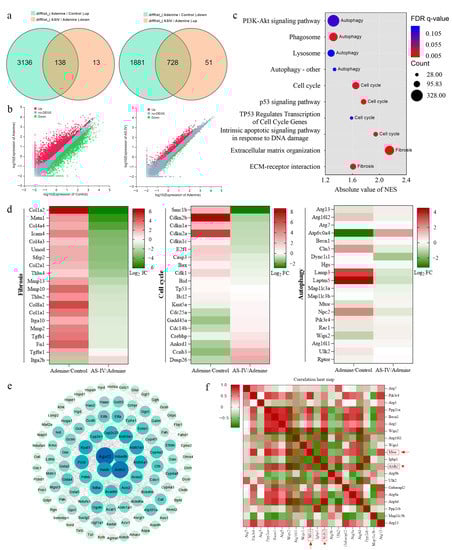 To systematically elucidate how ASIV treats renal fibrosis, we performed a transcriptomic analysis on the kidney tissues of the control group, the adenine group, and the ASIV-80 group rats. Compared with the control group, adenine treatment upregulated 3274 genes and downregulated 2609 genes, whereas ASIV treatment reversed 138 of the 3274 upregulated genes and 728 of the 2609 downregulated genes (Figure 3a,b). Gene set enrichment analysis (GSEA) revealed that ASIV-induced gene changes were mainly enriched in fibrosis, the cell cycle, and autophagy (Figure 3c,d). Moreover, a heat map based on the GSEA indicated that the renal genes involved in fibrosis, the cell cycle, and autophagy were significantly downregulated by ASIV in adenine-induced CKD rats (Figure 3d). To further determine the specific impact of ASIV on renal fibrosis from the molecular level, we integrated and analyzed the differentially expressed genes (DEGs) in RNA-Seq by performing a protein–protein interaction (PPI) network analysis using the STRING database (https://string-db.org, accessed on 12 February 2022). Specifically, the results show that four hub genes (Agxt2, ALDH2, Hadh, and Hibadh) were shown in the center of the PPI network (Figure 3e). After reviewing the literature, we found that the ALDH2 mRNA level was markedly downregulated in the kidneys of CKD patients compared with normal kidneys, while the other three genes were not reported [44,45]. In addition, it was reported that ALDH2 was associated with the regulation of autophagy [46]. Therefore, we made a heat map between ALDH2 gene and autophagy-related genes to show their relationship (Figure 3f). The depth of the color represents the correlation between the genes on the axes X and Y. Based on this concept, the heat map showed that the Aldh2 gene has a strong correlation with autophagy-related genes in the present study. Collectively, these results suggest that the remedial effects of ASIV on CKD rat kidneys might be involved in the alleviation of renal fibrosis, the regulation of ALDH2 expression, and the mediation of the cell cycle and autophagy.