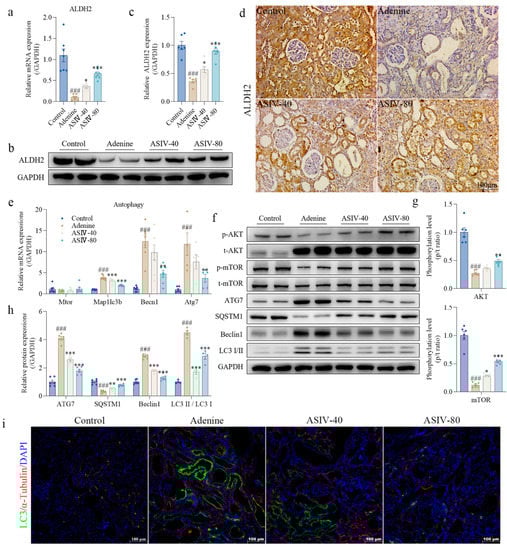 To experimentally validate the transcriptomics results, we performed qPCR and Western blotting on the same cohort to determine the gene and protein expressions of ALDH2 in the kidney tissues of each group of rats. The results show that adenine decreased the mRNA and protein expression levels of ALDH2 in rat kidneys, which was significantly reversed by ASIV (Figure 4a–c), and this was further certified using immunohistochemistry analysis for ALDH2 in the renal fibrosis of rats (Figure 4d). Furthermore, to detect the autophagy level of rat kidneys, we used qRT-PCR and Western blotting to determine the gene or protein expressions of ATG7, SQSTM1, Beclin1, and LC3, which are usually used as indicators of autophagy [47]. The results show that adenine significantly increased the gene and protein expression levels of ATG7, Beclin1, and LC3, whereas ASIV significantly decreased their expression levels (Figure 4e,f,h). Compared with the control group, adenine significantly decreased the expression of SQSTM1 in the rat kidneys, which was significantly reversed by ASIV (Figure 4f,h). Similarly, the immunofluorescence analysis showed that compared with the control group, adenine significantly increased the expression of LC3 in the rat kidneys, which was significantly inhibited by ASIV (Figure 4i). Given that the AKT/mTOR signaling pathway is a key autophagy regulator in many pathophysiological processes associated with kidney disease [48,49], we used Western blotting to detect the activation of the AKT/mTOR pathway in the renal tissue, and the results show that the phosphorylation levels of AKT and mTOR were significantly decreased by adenine in the rat kidneys. However, ASIV significantly recovered the phosphorylation of AKT and mTOR (Figure 4f,g). Altogether, these data demonstrate that ASIV promotes the expression of ALDH2, inhibits autophagy, and activates AKT/mTOR signaling pathways in the kidneys of CKD rats.