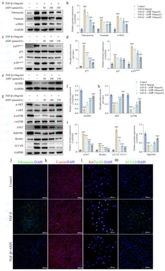 ASIV mitigates EMT and G2/M arrest, promotes ALDH2 expression, inhibits autophagy, and activates AKT/mTOR signaling pathway in TGF-β1-stimulated HK-2 cells. (a) Protein expressions of fibronectin, vimentin, and α-SMA in HK-2 cells using Western blotting. (b) Quantitative analysis of the relative protein expressions of fibronectin, vimentin, and α-SMA. (c) Protein expressions of p-p53ser15, p53, p21, and p-H3ser10 in HK-2 cells using Western blotting. (d) Quantitative analysis of the phosphorylation level of p53 and the relative protein expressions of p21 and p-H3ser10. (e) Protein expression of ALDH2 in HK-2 cells using Western blotting. (f) Quantitative analysis of the relative protein expression of ALDH2. (g) Protein expression of p-AKT, t-AKT, p-mTOR, t-mTOR, ATG7, SQSTM1, Beclin1, and LC3 I/II in HK-2 cells using Western blotting. (h) Quantitative analysis of the phosphorylation levels of AKT and mTOR in HK-2 cells. (i) Quantitative analysis of the relative protein expressions of ATG7, SQSTM1, Beclin1, and LC3 II/LC3 I in HK-2 cells. Representative images of immunofluorescence staining for (j) fibronectin, (k) F-actin, (l) Ki67 (red)/p-H3 (green), and (m) LC3 I/II in HK-2 cells. Data are presented as mean ± SEM (n = 3, 100 µm scale bar). One-way ANOVA was followed by Dunnett’s multiple comparisons test. ### p < 0.001 vs. the control group, * p < 0.05, ** p < 0.01, *** p < 0.001 vs. the TGF-β1 group.