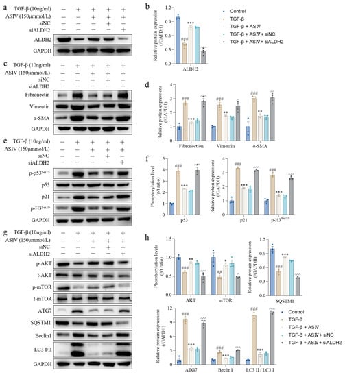 To further illustrate the role of the ALDH2 in ASIV treatment, small interference RNA was used to knock down ALDH2. The interference efficiency of ALDH2 siRNA is shown in Figure S6a,b. The results show that ALDH2 siRNA significantly restrained the ASIV-induced promoting effect on ALDH2 protein expression in TGF-β1-stimulated HK-2 cells, whereas the negative control siRNA did not (Figure 6a,b). Further results show that ALDH2 siRNA significantly offset the inhibiting effect of ASIV on the protein expressions of fibronectin, vimentin, and α-SMA in TGF-β1-stimulated HK-2 cells (Figure 6c,d). In addition, ALDH2 siRNA remarkably counteracted the suppressive effect of ASIV on the protein expressions of p-p53, p21, and p-H3 in vitro (Figure 6e,f). Furthermore, under the treatment of ALDH2 siRNA, ASIV not only failed to restrain the protein expressions of ATG7, Beclin1, and LC3 II/LC3 I but did not upregulate the phosphorylation levels of AKT and mTOR, as well as the protein expression of SQSTM1 in the TGF-β1-stimulated HK-2 cells (Figure 6g,h). Similarly, immunofluorescence staining showed that the remedial effects of ASIV on renal fibrosis in TGF-β1-stimulated HK-2 cells were all blocked by ALDH2 siRNA (Figure 6i–l). Altogether, these results suggest that ALDH2 is necessary for ASIV in mitigating EMT and G2/M arrest, inhibiting autophagy, and activating AKT/mTOR signaling pathways in vitro.