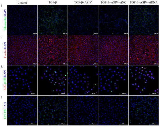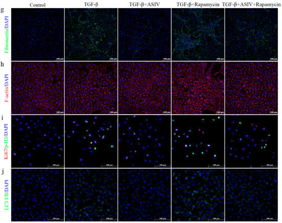 Immunofluorescence staining was carried out to detect the effect of ASIV on the phenotype of EMT, G2/M arrest, and autophagy in TGF-β1-stimulated HK-2 cells. The results show that TGF-β1 leads to a significant increase in the expression of fibronectin (Figure 5j) and F-actin (Figure 5k) in HK-2 cells, which was significantly reversed by ASIV, indicating that ASIV mitigates TGF-β1-induced EMT in vitro. G2/M arrest affected the proliferation efficiency of the epithelial cells [51]. In the present study, to determine the cells in proliferation and/or arrested in G2/M phase, we used immunofluorescence double staining for ki67 and p-H3 to gauge the cell cycle distribution, and the results show that the expression of Ki67 and p-H3 increased in the TGF-β1-induced HK-2 cells and was reversed by ASIV treatment (Figure 5l). The immunofluorescence analysis for LC3 I/II showed that ASIV significantly decreased the expression of LC3 induced by TGF-β1 in vitro (Figure 5m). Taken together, these results further indicate that ASIV alleviates EMT and G2/M arrest, promotes the expression of ALDH2, inhibits autophagy, and activates the AKT/mTOR signaling pathway in TGF-β1-stimulated HK-2 cells.