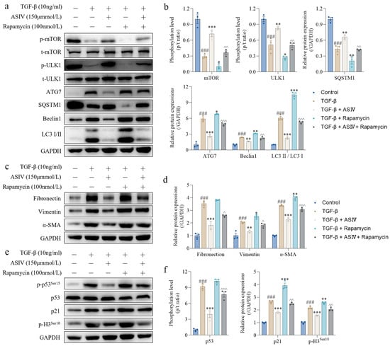 Rapamycin, an mTOR inhibitor that can induce autophagy, was used to further investigate the role of mTOR-mediated autophagy in the anti-fibrotic effect of ASIV in vitro. The results show that the ASIV-induced phosphorylation of mTOR and ULK1, upregulation of the SQSTM1 protein, and downregulation of proteins, including ATG7, Beclin1, and LC3 II/LC3 I, were significantly inhibited by rapamycin in TGF-β1-stimulated HK-2 cells (Figure 7a,b). Then, we detected the effects of autophagy on the TGF-β1-induced phenotypes of EMT and G2/M arrest in vitro. The results show that rapamycin significantly blocked the restraining effect of ASIV on the protein expressions of fibronectin, vimentin, and α-SMA in vitro (Figure 7c,d). Additionally, under treatment with rapamycin, ASIV failed to decrease the protein expressions of p-p53, p21, and p-H3 in vitro (Figure 7e,f). Additionally, we observed the effect of rapamycin on the phenotype and investigated the effect of ASIV on the rapamycin-induced phenotype. The results show that rapamycin led to the phosphorylation of mTOR and the increasing expression of LC3 II/LC3 I, fibronectin, and p-H3 (Figure S7a,b), which indicated similar phenotypes induced by TGF-β1 in HK-2 cells. Furthermore, ASIV could significantly reverse these phenotypes induced by rapamycin. Similarly, immunofluorescence staining showed that rapamycin blunts the therapeutic effects of ASIV on renal fibrosis in TGF-β1-stimulated HK-2 cells (Figure 7g–j). Taken together, these data indicate that mTOR-mediated autophagy is necessary for the ASIV-induced mitigation of EMT and G2/M arrest in vitro.
