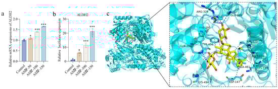 ASIV upregulates the transcriptional activity of ALDH2 promoter, and molecular docking predicts the potential interaction between ASIV and ALDH2. (a) Relative gene expression of ALDH2 in HK-2 cell using qRT-PCR. (b) Relative luciferase expression of ALDH2 promoter in HEK-293T cells. (c) Autodock Vina software predicts the ligand–protein interaction between ASIV and ALDH2. Data are presented as mean ± SEM. One-way ANOVA was followed by Dunnett’s multiple comparisons test. * p < 0.05, *** p < 0.001 vs. the control group.