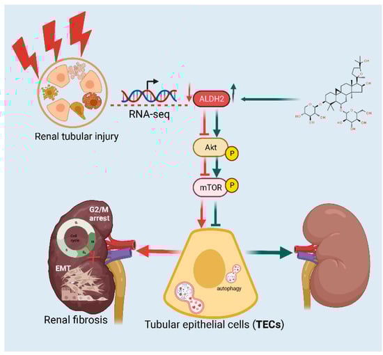 The following supporting information can be downloaded at: https://www.mdpi.com/article/10.3390/cells12131777/s1, Table S1: Primers used in RT-qPCR Analysis. Figure S1: (a) Body weight, (b) serum Crea, and (c) serum BUN were measured when the modeling of rats was finished. *** p < 0.001 vs. the control group. Figure S2: Quantitative analysis of immunofluorescence for fibronectin, α-SMA, and p-H3/Ki67 in rat kidneys. Mean ± SEM. ### p < 0.001 vs. the control group; * p < 0.05, *** p < 0.001 vs. the adenine group. Figure S3: Gene set enrichment analysis (GSEA) for (a) extracellular matrix organization, (b) cell cycle, and (c) phagosome in kidney tissues. Figure S4: (a) Quantitative analysis of immunohistochemistry staining for ALDH2 in rat kidneys. (b) Quantitative analysis of immunofluorescence staining for LC3 in rat kidneys. Mean ± SEM. ### p < 0.001 vs. the control group; * p < 0.05, ** p < 0.01, *** p < 0.001 vs. the adenine group. Figure S5: (a) Cell viability was measured under treatment with TGF-β1 (10 ng/mL) or TGF-β1 (10 ng/mL) plus different concentrations of ASIV (10, 50, 100, and 150 μM). (b) Protein expression of LC3 I/II in HK-2 cells treated using Western blotting. (c) Quantitative analysis of the relative protein expression of LC3 II/LC3 I in the renal tissues. Mean ± SEM. *** p < 0.001. (d) Quantitative analysis of immunofluorescence for fibronectin, F-actin, p-H3/Ki67, and LC3 in TGF-β1-stimulated HK-2 cells. Mean ± SEM. ### p < 0.001 vs. the control group; *** p < 0.001 the TGF-β1 group. Figure S6: (a) Protein expression of ALDH2 in HK-2 cells treated with siNC or siALDH2 using Western blotting. (b) Quantitative analysis of the relative protein expression of ALDH2. (c) Quantitative analysis of immunofluorescence for fibronectin, F-actin, p-H3/Ki67, and LC3 in TGF-β1-stimulated HK-2 cells. Mean ± SEM. ### p < 0.001 vs. the control group; *** p < 0.001 vs. the TGF-β1 group; ^^^ p <0.001 vs. the TGF-β1 + ASIV group. Figure S7: (a) Protein expression of p-mTOR, t-mTOR, LC3 I/II, fibronectin, and p-H3ser10 in HK-2 cells using Western blotting. (b) Quantitative analysis of the phosphorylation level of mTOR and the relative protein expressions of p-mTOR, t-mTOR, LC3 I/II, fibronectin, and p-H3ser10. Mean ± SEM. ### p < 0.001 vs. the control group; * p < 0.05, ** p < 0.01, *** p < 0.001 vs. the rapamycin group. (c) Quantitative analysis of immunofluorescence for fibronectin, F-actin, p-H3/Ki67, and LC3 in TGF-β1-stimulated HK-2 cells. Mean ± SEM. ### p < 0.001 vs. the control group; ** p < 0.01, *** p < 0.001 vs. the TGF-β1 group; ^^ p < 0.01, ^^^ p < 0.001 vs. the TGF-β1 + ASIV group. Figure S8: Structure of ALDH2 promoter plasmid.