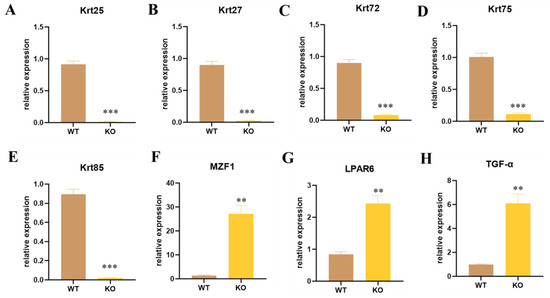 Expression level detection of different paralog genes and controlling genes in Krt71–KO mice. (A–H) The expressions of different genes were determined by qRT–PCR. WT, WT control; KO, Krt71 gene knockout mice (n = 3, ** p < 0.01, *** p < 0.001).