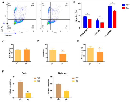 Regardless of the mutation type, Krt71–KO mice showed the nude phenotype at 3–4 weeks old (Figure S2A), and the mice gradually regained their hair as they became older. In addition, we also found that Krt71–KO mice restored their normal hair density in development with age (Figure S2C). The hair growth in Krt71–KO mice exhibited a cyclic pattern, which was similar to NuRabbits [26]. Therefore, to test whether Krt71–KO mice were similar to NuRabbits that were immunodeficient, we collected peripheral blood from the central ocular veins of mice who were 6 weeks old and analyzed these for populations of circulating lymphocytes. By flow cytometry, there was an apparent decrease in the percentage of T lymphocytes in Krt71–KO mice compared with WT mice (Figure S2B and Figure 6A). With regards to the T cell subsets, populations of CD8–positive cells declined, whereas they had no significant differences, and CD4–positive T cells dramatically decreased from 20% to 13.9% (Figure 6A,B). However, on a postmortem examination, there were no marked reductions or absences in the thymus of Krt71 and WT mice (Figure S2C). In Krt71–KO mice, body weights and thymus weights were both not significantly lower than that of WT mice (Figure 6D,E). We detected T cell subsets of the thymus and found that there were no differences between WT and Krt71–KO mice (Figure S2D,E). Interestingly, previous studies have found that nude–mice exhibit the prominent up–regulation of keratin (Krt23, −73, −82, −16, −17) [27]. Furthermore, a significantly reduced Foxn1 mRNA expression was observed in the Krt71–KO mice compared with the WT mice (Figure 6F). Thus, our results indicate that Foxn1 may have a negative correlation with Krt71 and other keratins in mice.