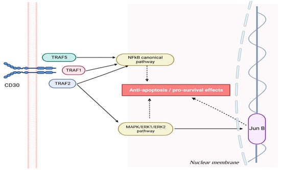 The CD30 molecule plays a critical role in cell survival by engaging various signaling pathways that confer an advantage to cells with higher CD30 levels. When activated, CD30 forms trimers and sends out signals through tumor necrosis factor receptor-associated proteins (TRAF), specifically TRAF2, TRAF1, and TRAF5, to stimulate nuclear factor-kappa B (NFkB) pathways and thus increase survival chances. CD30 binding initiates signaling through mitogen-activated protein kinase (MAPK) pathways, including ERK1 and ERK2, that activate mitogen-activated protein kinase kinase kinase. This provides cancerous cells with various anti-apoptotic and pro-survival benefits, with JunB acting as a nuclear transcription factor to further support survival while upregulating CD30 expression.