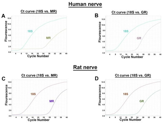RT-PCR detection of MR and GR mRNA (A) in human and rat peripheral nerve trunk. Identification of both MR (A,C) and GR (B,D) mRNA by specific primers in human (A,B) and rat (C,D) peripheral nerve. For all four combinations, amplification plots with cycle threshold (Ct) values for MR (human: 24; rat: 26) and for GR (human: 21; rat: 23) vs. 18S (human: seven; rat: eight) are provided.