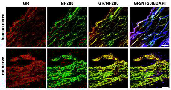 Double-immunofluorescence confocal microscopy of the rat nerve shows abundant colocalization of GR with NF200. Similarly, there is obvious colocalization of GR with NF200 in the human nerve (Figure 2). Neurofilament 200 is well known to be highly expressed in adult myelinated peripheral axons [].