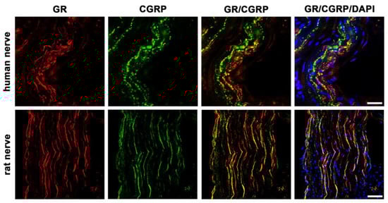 To investigate whether GR localized in the peripheral nerve fibers of sectioned nerve trunks from humans compared to rats, we performed double immunofluorescence staining using the sensory neuronal marker CGRP, which is known to be predominantly expressed in small- to medium-sized unmyelinated C-fiber neurons and thinly myelinated A-δ neurons known to transmit painful stimuli [,] (Figure 3).