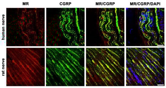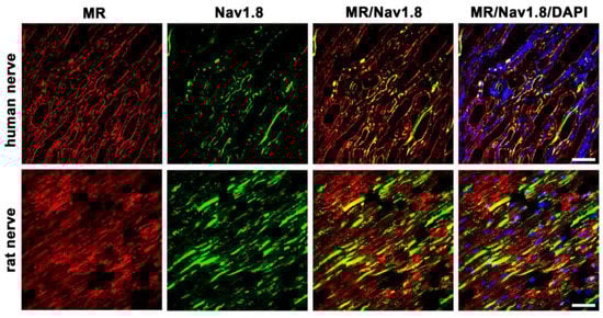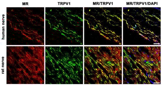 In the present study we identified the Nav1.8 channel in human nerve fibers. For this, we used a specific antibody against the tetrodotoxin (TTX)-resistant voltage-gated Nav1.8 channel, which is known to be specifically expressed in unmyelinated, small-diameter, nociceptive C-fibers (Figure 6). Moreover, double immunofluorescence confocal microscopy showed some colocalization of MR and Nav1.8 in human and rat peripheral nerve fibers, which show some colocalization of MR and Nav1.8. However, some nerve fibers express either MR- or Nav1.8 immunoreactivity alone.