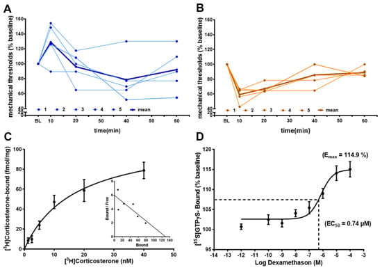 Intrathecal GR-agonist dexamethason reduces hyperalgesia, whereas MR-agonist aldosterone increases hyperalgesia via immediate non-genomic effects. (A,B) In rats (n = five per group) i.th. dexamethason (20 µg/20 µL) reduced, within minutes, hindpaw inflammation-induced hyperalgesia in rats (p < 0.05, repeated measurement ANOVA); in contrast, i.th. aldosterone (40 µg/20 µL) evoked, within minutes, mechanical hyperalgesia in normal rats (p < 0.05, repeated measurement ANOVA, post-hoc Dunnett’s test). Individual time courses of mechanical von Frey filament thresholds are shown in light blue (A) for dexamethasone and light brown (B) for aldosterone, while the time courses of mean values are shown in bold blue and bold brown, respectively. (C) Membrane fractions from lumbar (L3–L5) dorsal root ganglia of rats show saturable GR binding of [3H]Corticosterone with a Bmax = 112 fmol/mg protein and a Kd = 16.9 nM (n = 5, in duplicate) (p < 0.05, one-way ANOVA, post-hoc Dunnett’s test). (D) The same membrane fractions incubated with increasing doses of the GR-agonist dexamethasone reveal saturable [35S]GTPγS binding (n = five, in duplicate) suggesting immediate non-genomic effects involving G protein coupling (p < 0.05, one-way ANOVA, post-hoc Dunnett’s test).