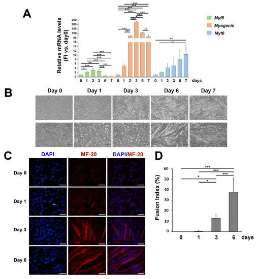C2C12 cells have been used as a well-established model of myogenesis. To assess cell myogenic differentiation in our culture system, we evaluated morphological and molecular features of C2C12 cells treated with DM up to 7 days (Figure 1). As expected, the mRNA expression of the early myogenic differentiation marker Myf5 increased in the first days of differentiation and then progressively decreased up to 7 days; the mRNA expression of the transcription factor of the intermediate phase of skeletal muscle differentiation, Myogenin, peaked at day 2–6; the mRNA expression of the late myogenic differentiation gene Myf6 increased in the later days of in vitro differentiation (Figure 1A). Myogenic differentiation was also confirmed with the morphological analysis, as C2C12 progressively elongated and fused forming myotubes (Figure 1B,C)), with a consequent significant increase in the fusion index (Figure 1D).