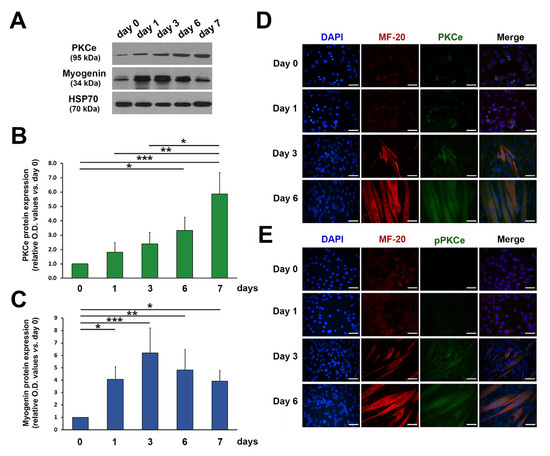 PKCe and phospho-PKCe (pPKCe) protein content in C2C12 cells during differentiation. (A) A representative Western blot showing protein content of PKCe and Myogenin during C2C12 cell differentiation; HSP70 was used as a loading control. (B,C) The densitometry analysis relative to PKCe/HSP70 (B) and Myogenin/HPS70 (C) protein content during C2C12 cell differentiation expressed as the fold increase in proliferating myoblasts (day 0) for each time point. Data are presented as means ± SD of at least 3 independent experiments. (* p < 0.05, ** p < 0.01, *** p < 0.001 with the one-way ANOVA followed by the Tukey test). (D,E) Representative immunofluorescence of PKCe and the myosin heavy chain (MF-20) (D) and of pPKCe and the myosin heavy chain (E) in the proliferating myoblast (day 0) and in the differentiation medium (day 1, day 3, and day 6). Nuclei were stained in blue by DAPI, myosin in red, and PKCe and pPKCe in green by specific antibodies (D,E), respectively. The scale bar corresponds to 50 μm.