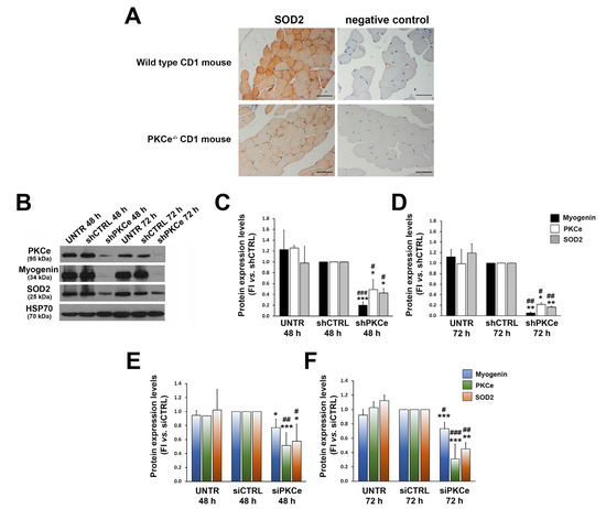 Effects of PKCe down-modulation on SOD2 expression. (A) Representative immunohistochemistry of SOD2 protein content in tibialis muscle of wild-type and PKCe−/− mice. The scale bar corresponds to 50 μm. (B) A representative Western blot showing PKCe, Myogenin, and SOD2 protein content in C2C12 untreated (UNTR) and infected with PKCe shRNA (shPKCe) or a shRNA negative control (shCTRL) after 48 and 72 h of puromycin selection. HSP70 was used as a loading control. (C,D) The densitometry analysis of PKCe, Myogenin, and SOD2 protein content in C2C12 untreated (UNTR) and infected with PKCe shRNA (shPKCe) or a shRNA negative control (shCTRL) after 48 (C) and 72 h (D) of puromycin selection. Protein content was normalized to HSP70 protein content for each experimental condition and each time point. Data are reported as the fold increase in UNTR and shPKCe to shCTRL. Data are presented as means ± SD of at least 3 independent experiments (* vs. shCTRL: * p < 0.05, ** p < 0.01, *** p < 0.001; # vs. UNTR: # p < 0.05, ## p < 0.01, ### p < 0.001, the one-way ANOVA followed by the Tukey test). (E,F) The densitometry analysis of PKCe, Myogenin, and SOD2 protein content in C2C12 untreated (UNTR) and transfected with PKCe siRNA (siPKCe) or a siRNA negative control (siCTRL) after 48 (E) and 72 h (F) of transfection. Protein content was normalized to HSP70 for each experimental condition and each time point. Data are reported as the fold increase in UNTR and siPKCe to siCTRL. Data are presented as means ± SD of at least 3 independent experiments (* vs. siCTRL: * p < 0.05, ** p < 0.01, *** p < 0.001; # vs. UNTR: # p < 0.05, ## p < 0.01, ### p < 0.001, the one-way ANOVA followed by the Tukey test).