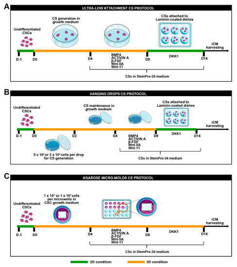 To compare the myogenic commitment and specification of the three CSC clones in three different scaffold-free methods, namely ultra-low attachment surface, hanging drops, and agarose micro-mold wells (Figure 1A), we first characterized the phenotypic and transcriptional changes occurring during the switch from 2D to 3D culture conditions, and then during CSC differentiation on the extracellular matrix (ECM)-derived laminin coating using the cardiosphere differentiation assay that we previously established and verified in our lab [21,23,24,37], in line with previous protocols established on iPSCs [18,19,20,38].