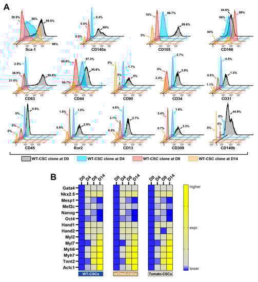 Time course of the phenotypic and transcriptomic characterization of CSC-derived cardiac spheroids. (A) FACS fluorescence histograms describing cell surface markers expression and modulation at D0, D4, D8, and D14 of the myogenic commitment in the WT-CSC clone (representative of n = 3). (B) Heat map showing qRT-PCR analysis of genes involved in biological processes as pluripotency, cardiac development, and muscle contraction in differentiating WT-CSCs, mT/mG-CSCs, and Tomato-CSCs at D0, D4, D8, and D14 of the myogenic commitment protocol. The data are representative of fold changes over the respective baseline value (D0) of each mRNA. The color scale indicates changes in Ct (threshold cycle) relative to the normalized GAPDH control (representative of n = 3). The data are expressed as mean ± S.D.