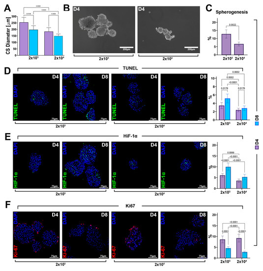 A high number of apoptotic cells has been previously reported within the “hypoxic core” of spheroids due to a lower distribution of oxygen and nutrient [11,12,13,14,15,27]. Based on this observation, we hypothesized that the reduction in CS size was linked to cell death events. To this aim, fixed and OCT-embedded CSs were cut in a sequential section to analyze the CS centermost. Once in the spheroid core, we assessed the number of TUNEL-positive cells in CSs from D4 to D8 generated in higher and lower cell seeding conditions. We found an increasing number of apoptotic cells in CSs generated using 2 × 105 cells, reaching 5.1 ± 1% at D8 of the cardiac differentiation protocol when compared to 2.8 ± 0.5% of apoptotic-positive cells counted in the CS generated from 2 × 104 cells per plate (Figure 4D). These data indicated that cell seeding density affects cell viability within the spheroids and that cell death was dependent on the number of cells used to form CSs.
